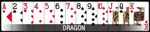 Untuk urutan setelah DRAGON tetap sama dengan permainan poker seperti biasanya, dimana urutan dari yang paling tertinggi adalah ROYAL FLUSH – STRAIGHT FLUSH – FOUR OF KIND – FULL HOUSE – FLUSH – STRAIGHT – THREE OF KIND – TWO PAIR – ONE PAIR – HIGH CARD.